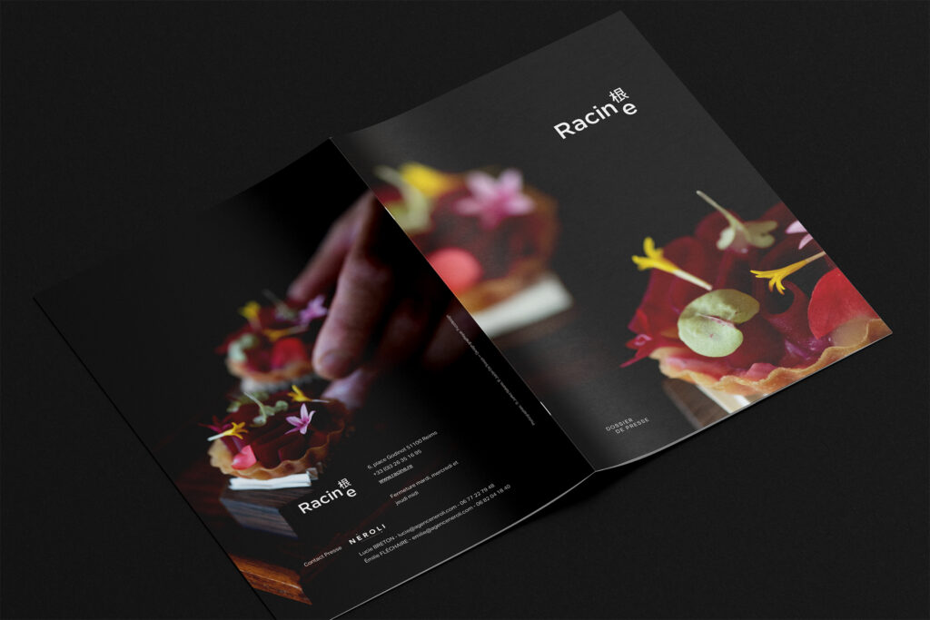 Le studio à imaginé le dossier de presse du restaurant de Kazuyki Tanaka à Reims, Racine.